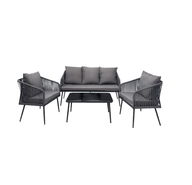 • Materiales: estructura de acero galvanizado, cuerda de poliéster, tela resistente al agua, vidrio negro en mesa