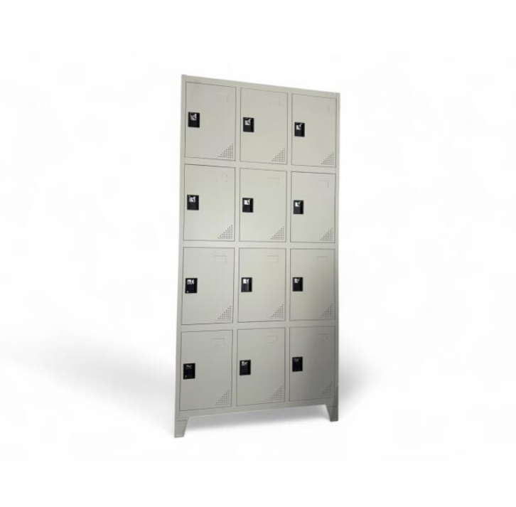 - Locker de metal de 12 compartimientos de estructura fuerte y firme (no remachada), construidos en metal en hierro 0,75mm de espesor, son pintados con pintura en polvo, a base de resina, utilizando un sistema de aplicación electrostático y polimerizado a más de 160 grados utilizando planchas de infrarrojo en los hornos, con fosfatizado que protege al mueble de la corrosión.