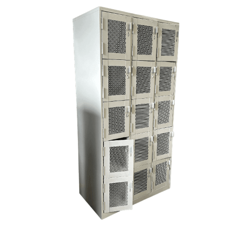 • Locker metálico de 15 puertas, espacios o compartimentos, con puerta en malla para una mayor ventilación, incluye aldaba para candado en cada una de las puertas.