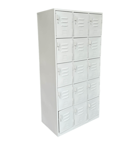 - Locker metálico de 15 puertas, espacios o compartimentos, fabricado con lamina de acero de .6mm;