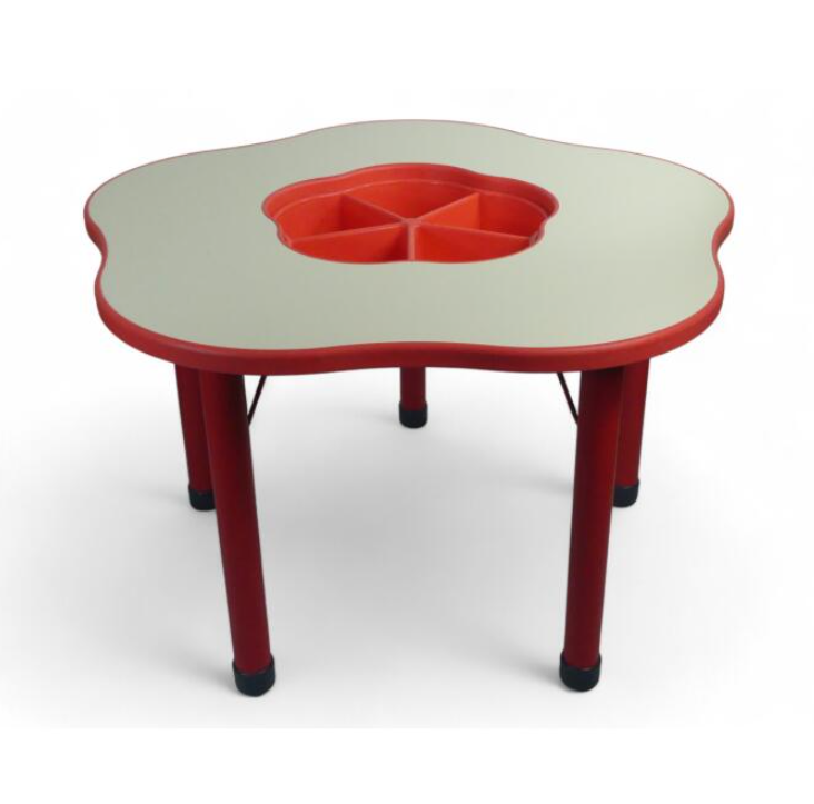- Esta mesa duradera presenta una superficie lisa gris con bordes de plástico redondeados de color, aseguran que durarán a través de los años. Cajonero para almacenar juguetes en el centro de la mesa del mismo color que el borde y las patas.
