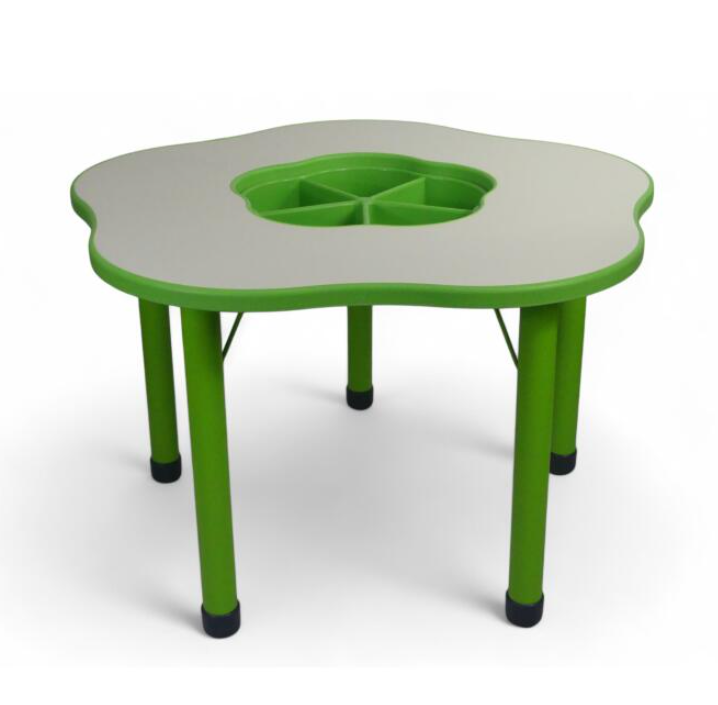 - Esta mesa duradera presenta una superficie lisa gris con bordes de plástico redondeados de color, aseguran que durarán a través de los años. Cajonero para almacenar juguetes en el centro de la mesa del mismo color que el borde y las patas.